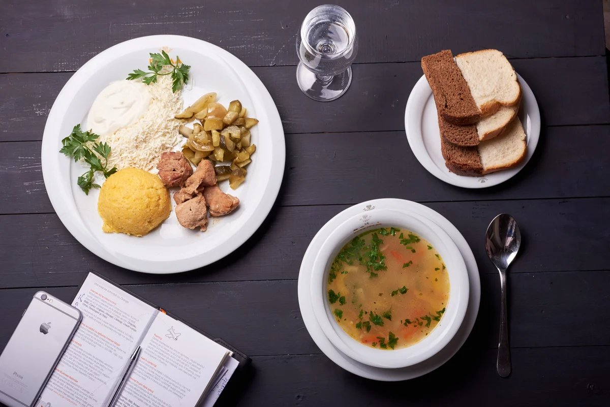 В 13-15 сделали заказ, официант нам сообщил, что суп ожидать 10мин, горячее 20, думаем, отлично, пока поедим супчик, принесут горячее.