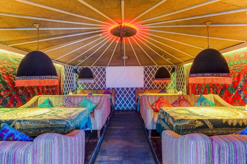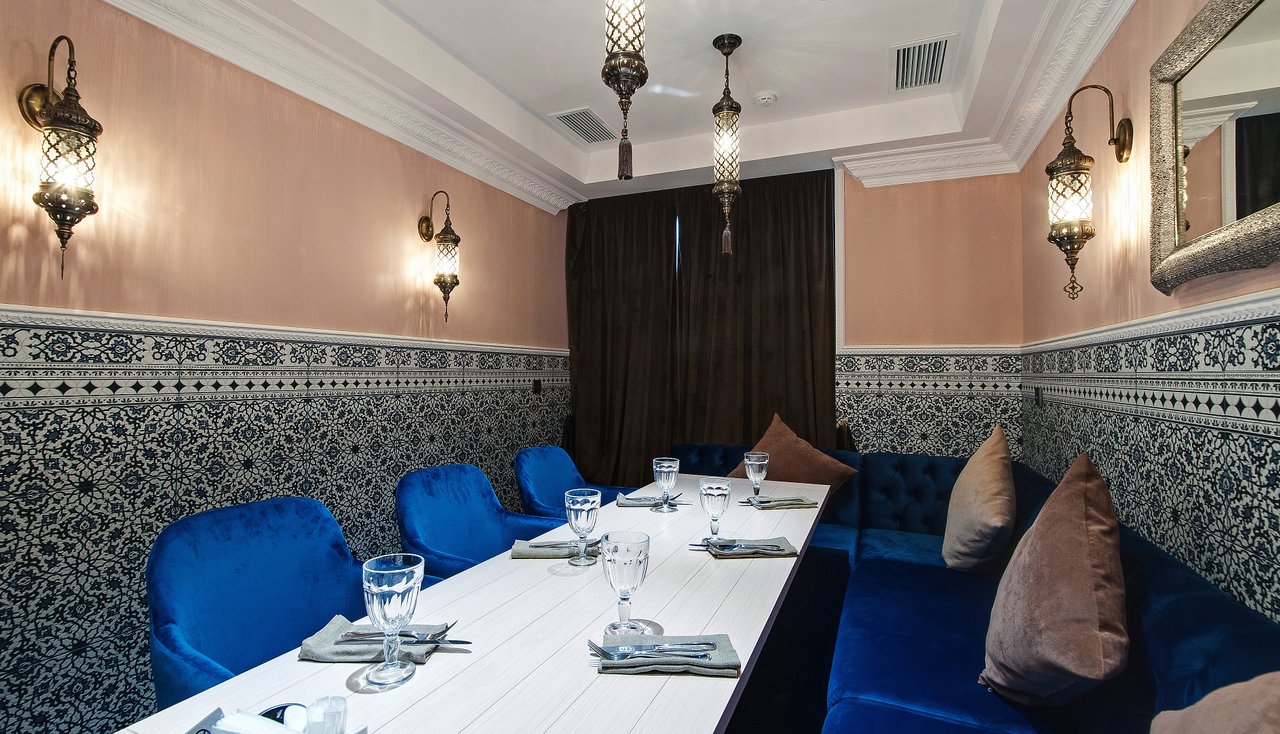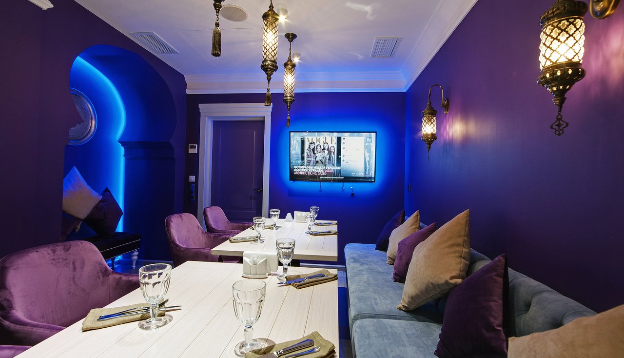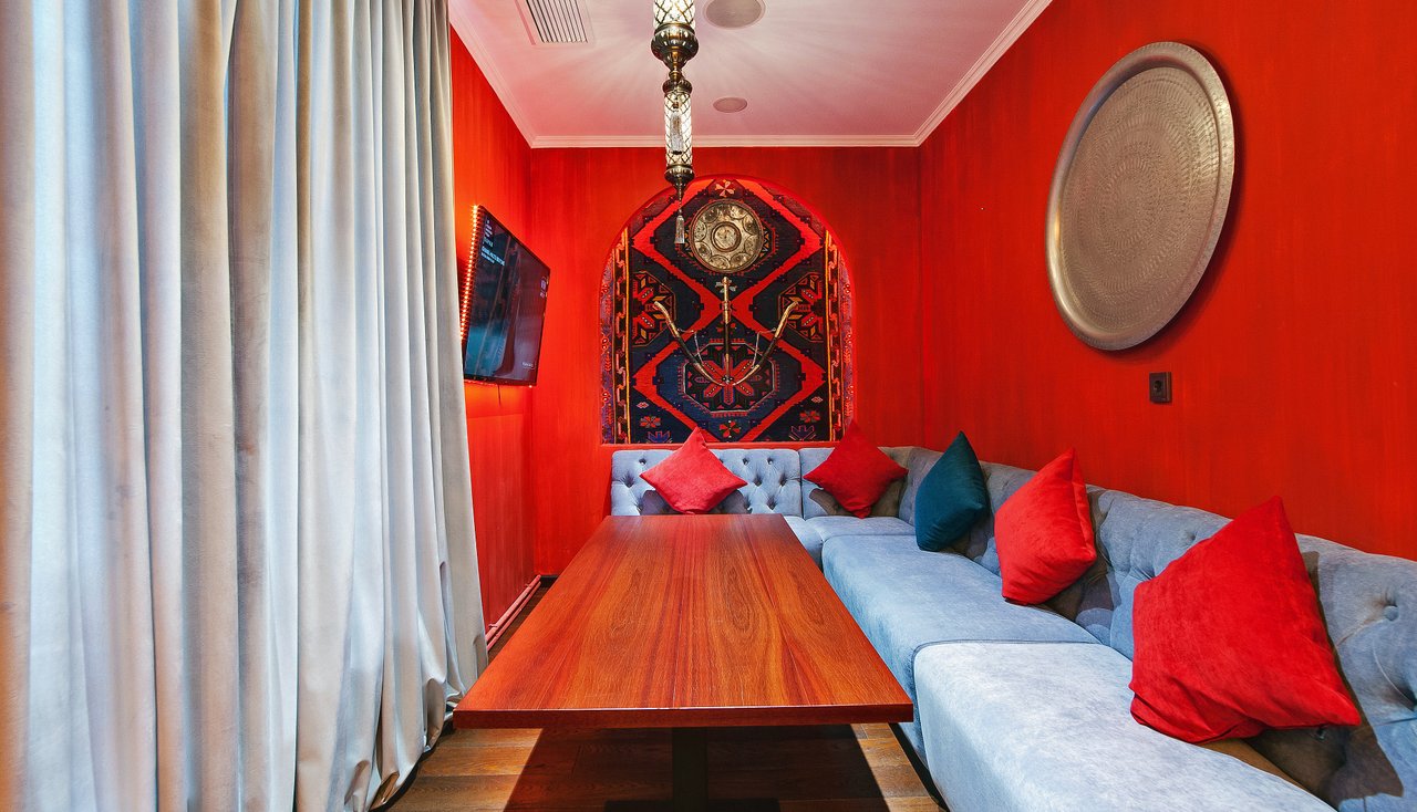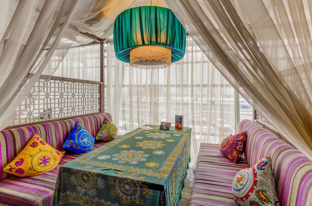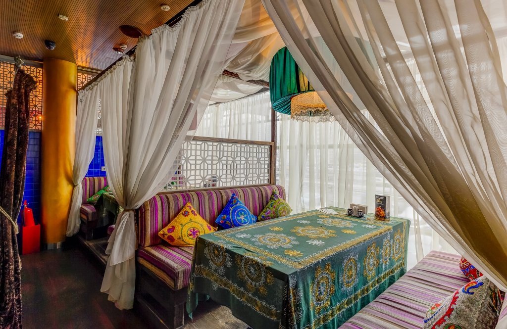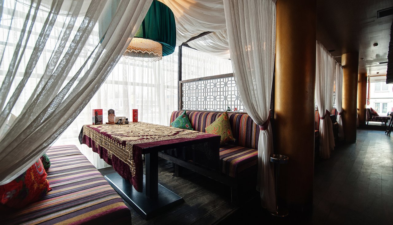 Проект "Урюк-кафе" задумывался владельцами, как место, где можно не только вкусно поесть, но и отдохнуть в максимально комфортной обстановке, позволяющей забыть о хлопотах и спешке мегаполиса. Надо признать, что им это отлично удалось. Как только попадаешь внутрь, тебя обволакивает теплом и ароматами кальяна и специй. В зале уютно, каждый стол отделяется легкими тканевыми занавесками. Устроившись на мягком диване в окружении ярких подушек, чувствуешь себя настоящей принцессой востока.